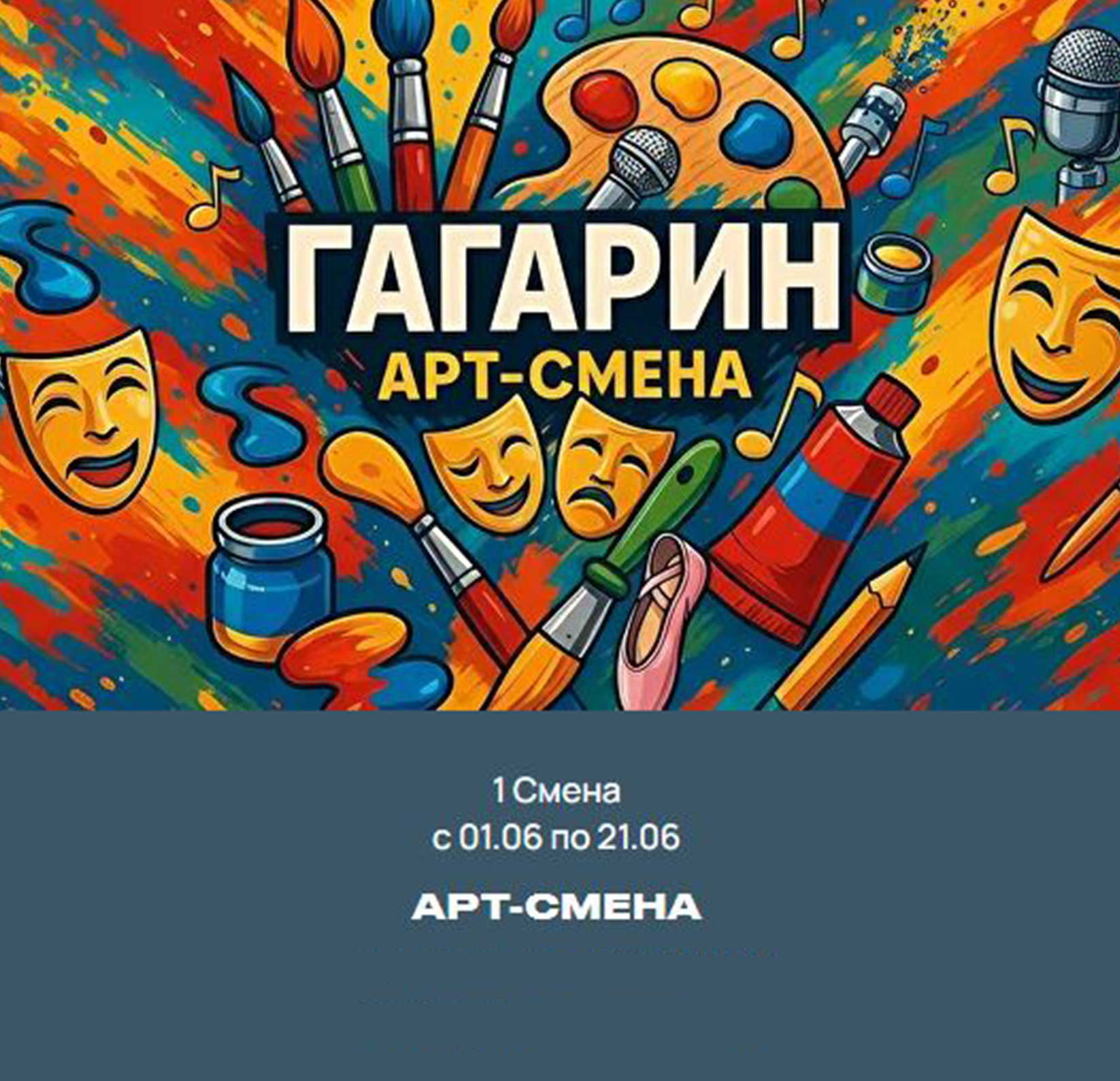 1 смена ГАГАРИН АРТ-СМЕНА ! с 01.06 по 21.06 Уникальная творческая программа, где каждый ребёнок раскрывает свои способности и воплощает самые смелые идеи. Смена наполнена яркими эмоциями, вдохновением и возможностями для самовыражения.
