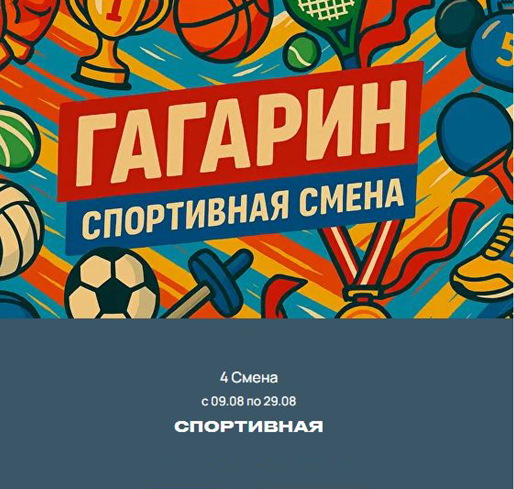 4 смена СПОРТИВНАЯ с 09.08 по 29.08 Активная программа для детей, которые любят движение, соревнования и командные игры. Смена направлена на развитие физических способностей, лидерских качеств и командного духа.