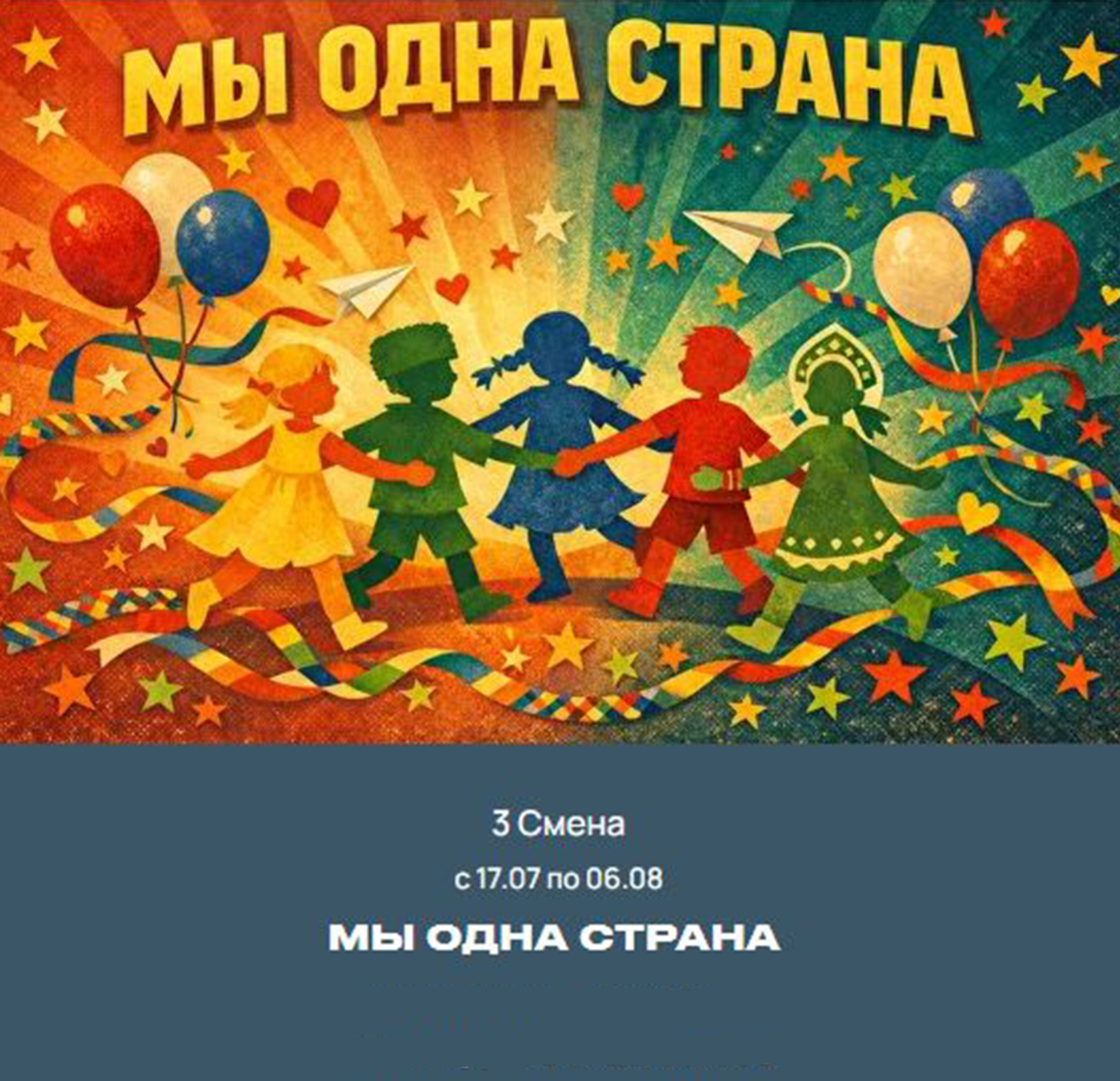 3 смена МЫ ОДНА СТРАНА ! с 17.07 по 06.08 ПРОГРАММА ДЛЯ РЕБЯТ, ГОТОВЫХ ОТКРЫТЬ ДЛЯ СЕБЯ УДИВИТЕЛЬНОЕ МНОГООБРАЗИЕ КУЛЬТУР И ТРАДИЦИЙ НАШЕЙ СТРАНЫ! СМЕНА ПОСВЯЩЕНА ГОДУ ЕДИНСТВА НАРОДОВ РОССИИ И ПОМОГАЕТ ДЕТЯМ ПОНЯТЬ, КАК БОГАТА И РАЗНООБРАЗНА НАША ОБЩАЯ РОДИНА.